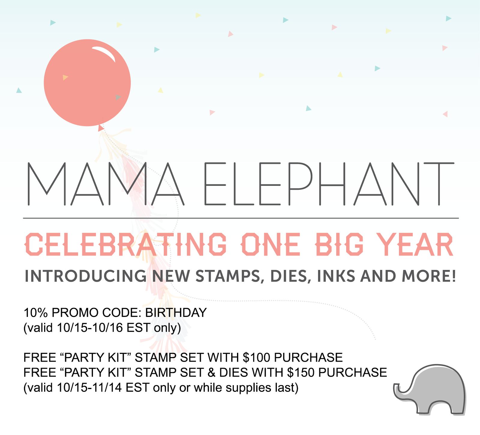 - FREE Party Kit stamp set and matching Party Kit die set with $150 purchase (after discount 10/15-11/14 EST only or while supplies last.)